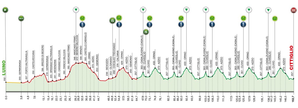 After a rolling start, five laps of an 18-kilometre circuit take in multiple ascents of the Orino and Casale climbs, with puncheurs and nimble sprinters eyeing victory in Cittiglio at the end of the 152.7 km race.