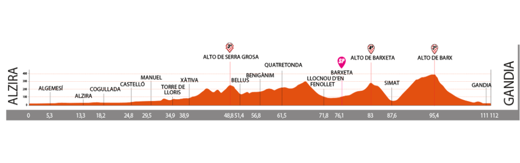 Stage 1 is on wide roads but has three categorized climbs to navigate including the Alto de Barx and its long plateau before the race drops down to the finish. With fresh legs in the peloton, it’s the most likely stage to finish in a reduced bunch sprint.