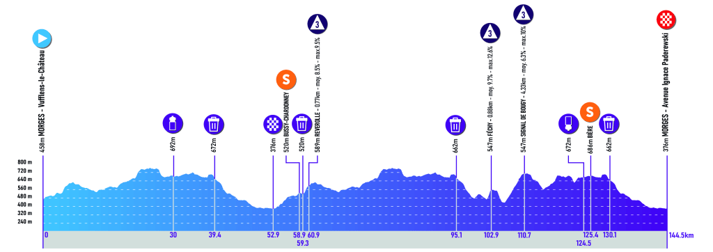 Romandie saves its longest stage for stage 3 and a showdown around Morges. With 1,878 meters of vertical gain, it’s also the day with the most climbing. The steep doubleheader of the Féchy and Signal de Bougy climbs inside the final 40km may act as the launchpad for overall victory.