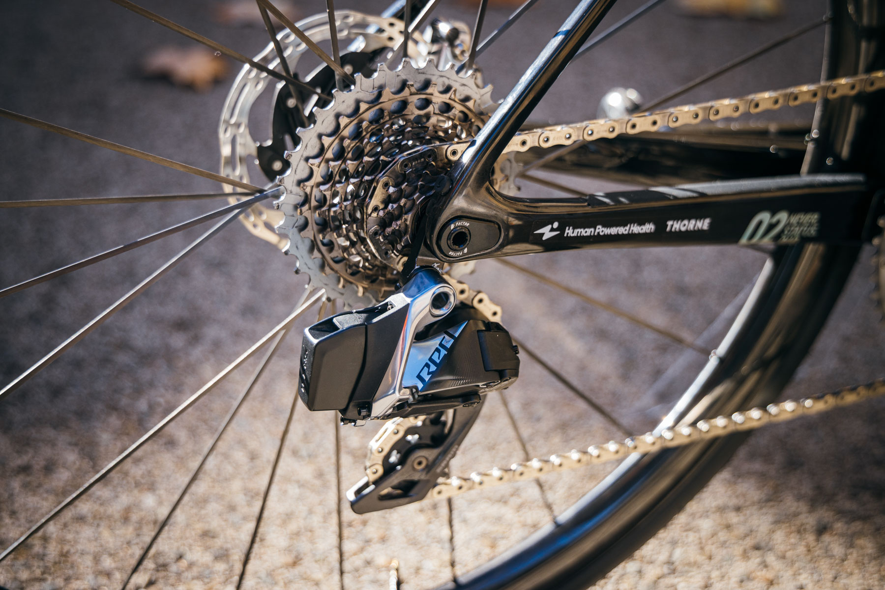 The first striking detail is the clear-coated carbon finish on the frame with hologram decals that give the O2 VAM a unique look in various light settings. Also noticeable is the revered Factor seatpost set at a 25-degree angle. Then comes the engine room.