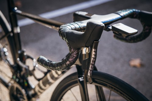 Equipped with an integrated barstem and wheelseets from Black Inc, SRAM Red eTap, Goodyear Eagle F1 Super Sport tires and Wahoo Speedlay pedals and ELEMNT BOLT V2 computer, this bike is ready for business.