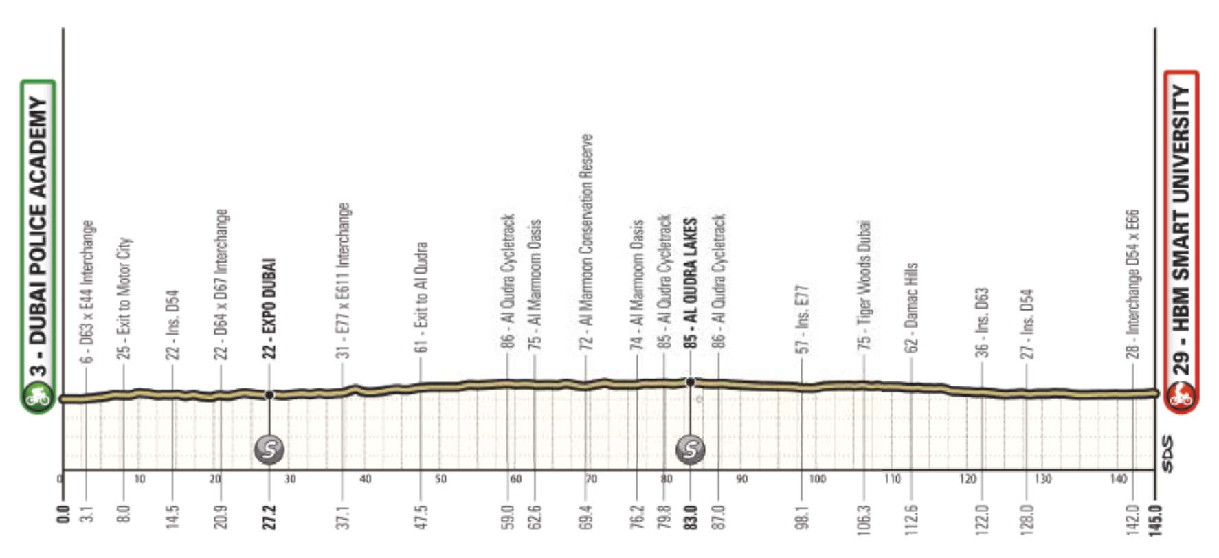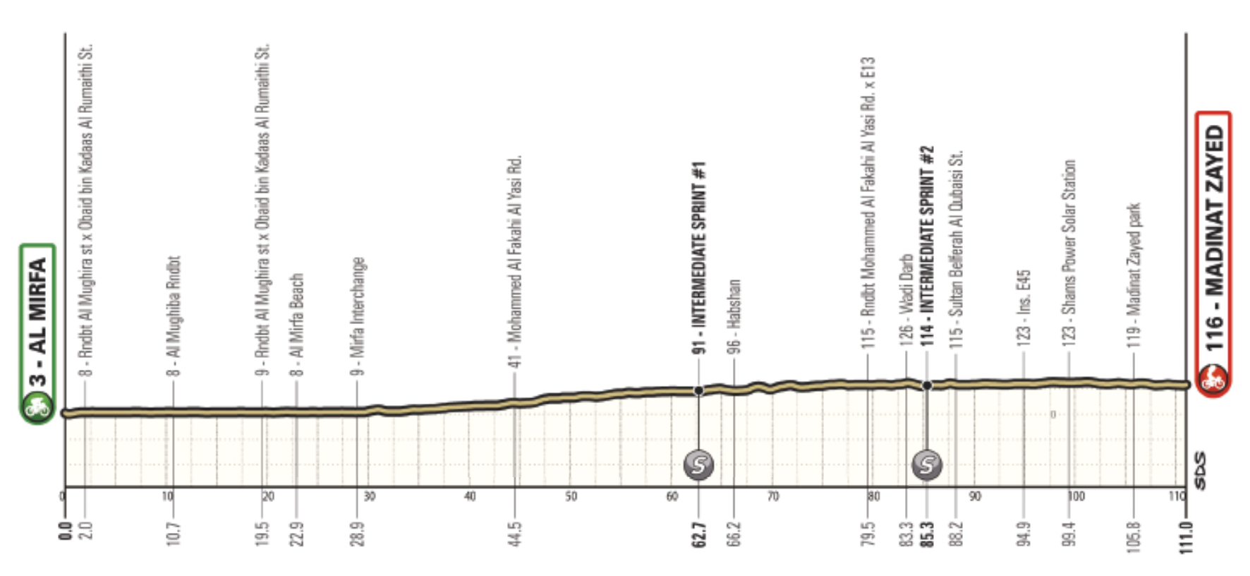 Stage 1 is an immediate test of a team’s overall strength. The road out of Al Mirfa has been used in every edition, in both directions, and is prone to race-splitting crosswinds. The sprint trains will have to be vigilant if they want to set up a mass bunch kick in Madinat Zayed.